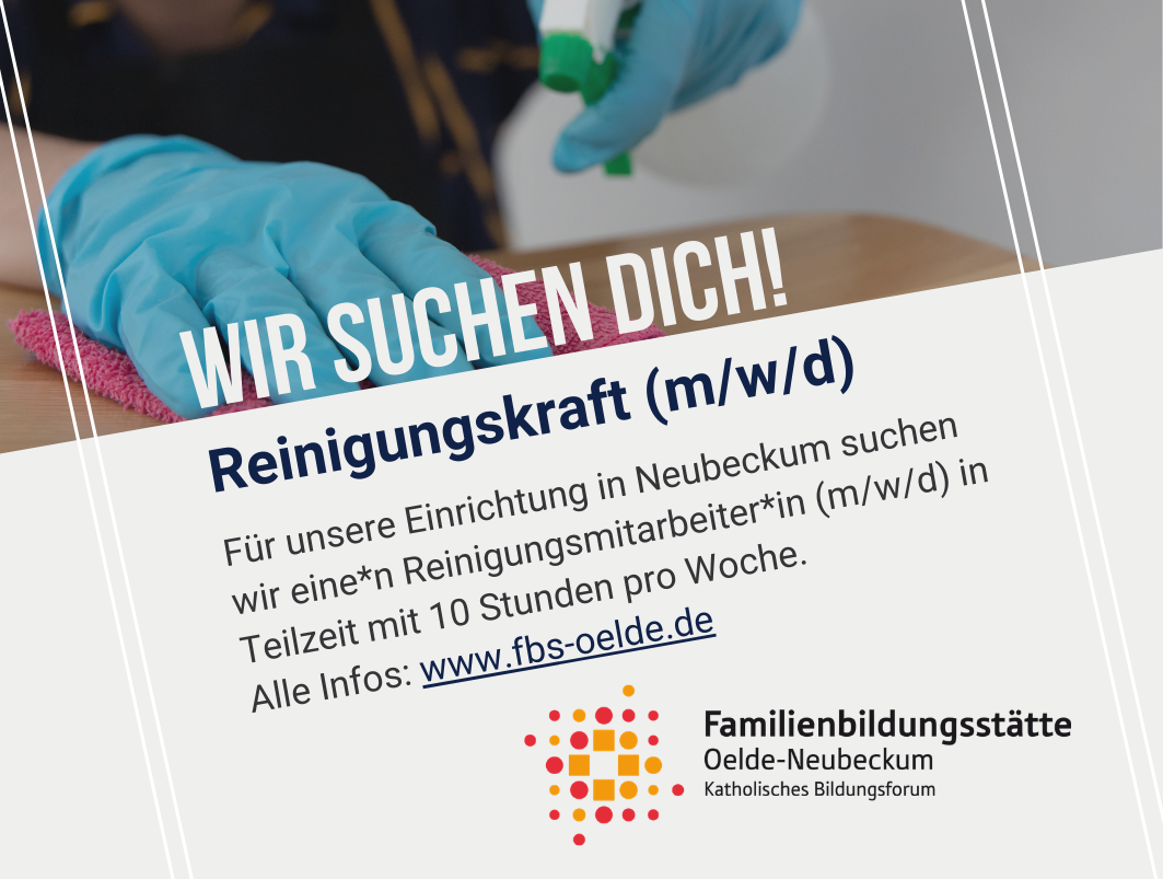 Die Familienbildungsstätte Oelde-Neubeckum sucht zum nächstmöglichen Zeitpunkt eine engagierte und zuverlässige Reinigungskraft (m/w/d) für die Einrichtung in Neubeckum mit einem Beschäftigungsumfang von 10,13 Wochenstunden. Wenn Sie selbstständig arbeiten, Verantwortung übernehmen und zu einem gepflegten und einladenden Umfeld für unsere Besucherinnen und Besucher beitragen möchten, freuen wir uns auf Ihre Bewerbung. ...